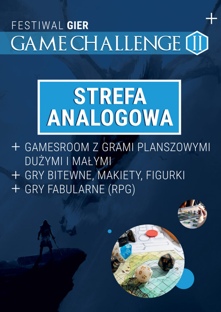 Strefa analogowa znajdować będzie się na parterze w holu głównym uczelni. W strefie tej znajdziemy całe mnóstwo gier planszowych – gamesroom przygotowany przez Hobbity.eu. Figurki, makiety i bitewniaki – gdzie ekipa „Bitwy przy Stole” zachwyci Was swoim hobby. Nie zabraknie także gier fabularnych, inaczej RPG (Role-Playing Games) –tu ekipa GnS ponownie porwie młodszych uczestników we wspaniały świat gier wyobraźni !