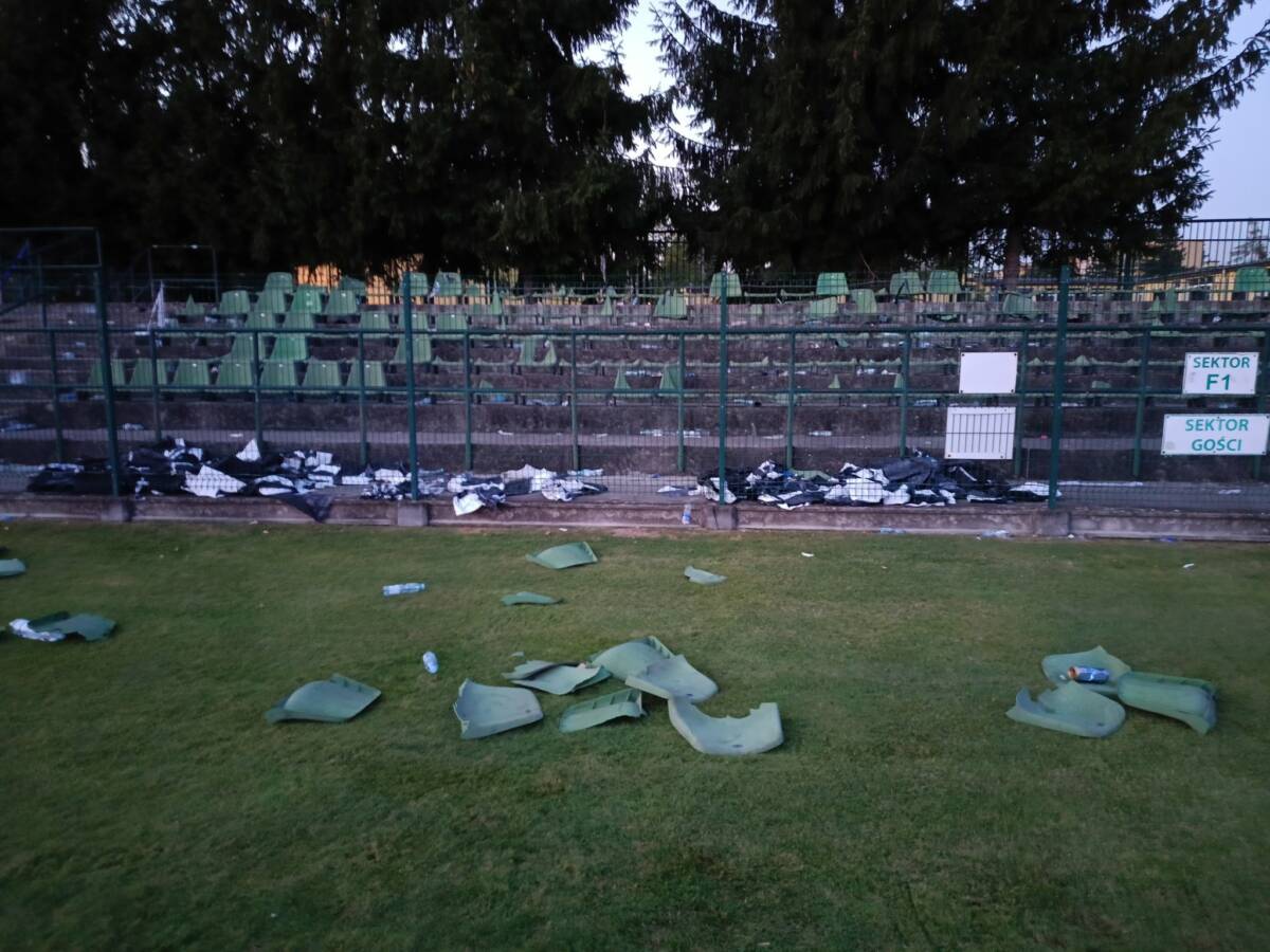–„Mecz przerwany, kibole gości demolują stadion Siarki” – napisał na Twitterze Maciej Szcześniewski. „Sączersi wspierani mocno przez Stal Mielec i Czarnych Jasło. Wyrywają krzesełka i rzucają na płytę” – dodał nieco później.