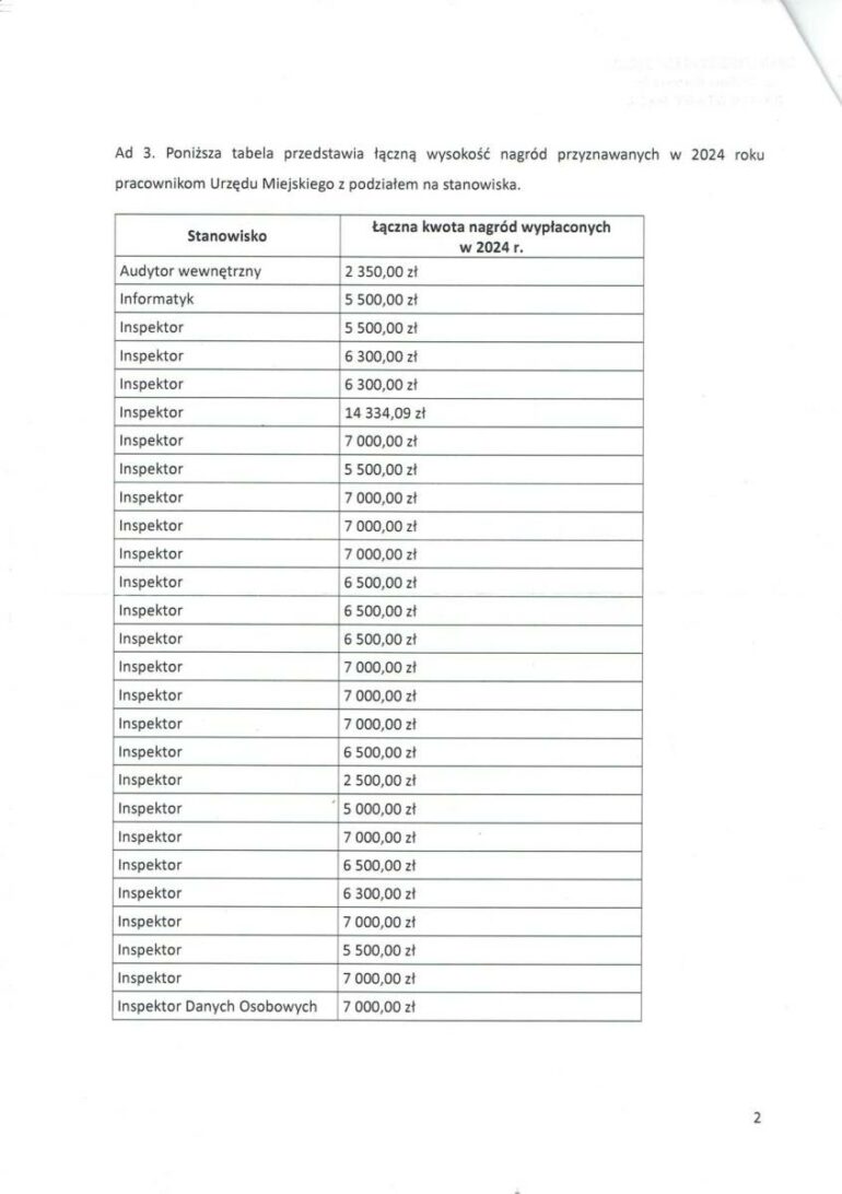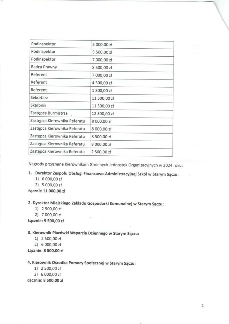 Radny Tomasz Koszkul w swojej interpelacji pytał także o łączną wysokość nagród przyznanych w 2024 roku pracownikom Gminy Stary Sącz z podziałem na stanowiska. Najwyższa nagroda na stanowisku inspektora to 14 334,09 złotych. Pozostałe kształtują się od 5500 do 7000. Jeśli chodzi o kancelistów, tu przyznano nagrody w wysokości od 4300 do 6500. Jest jednak wyjątek, jedna osoba na tym stanowisku otrzymała 12 834 zł. Wyjątków nie było natomiast na stanowiskach kierowników referatów, gdzie sumy nagród kształtują się pomiędzy 8500 a 9500 i podinspektorów, którzy otrzymali nagrody w wysokości od 3000 do 7734 złotych. Nagrody przyznano także trzem referentom a ich wysokość to 1300, 4300 i 7000 złotych. 8 500 złotych nagrody otrzymał w roku ubiegłym radca prawny gminy, 11 500 złotych sekretarz gminy i 12 300 zastępca burmistrza.