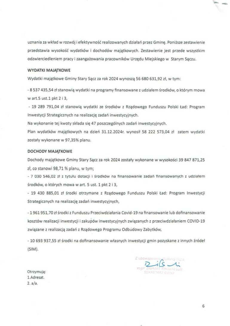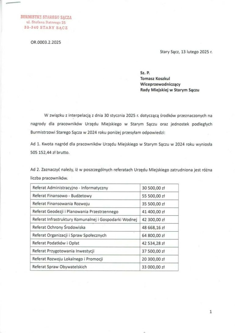 Odpowiedź na interpelację przyszła w piątek i potwierdziła, że kwota nagród dla urzędników Urzędu Miejskiego w roku 2024 wyniosła 505 152,44 złotych brutto. Jeśli chodzi o podział na referaty największa suma bo blisko 65 tysięcy złotych trafiła do Referatu Organizacji i Spraw Społecznych. Najmniej natomiast do Referatu Rozwoju Lokalnego i Promocji i było to 20 300 zł. Na stronach Biuletynu Informacji Publicznej Gminy Stary Sącz nie ma informacji o liczbie osób zatrudnionych w poszczególnych referatach.
