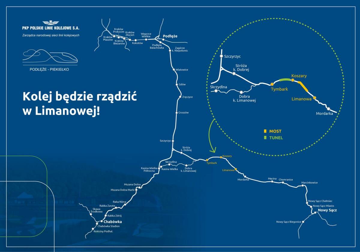 Największa inwestycja kolejowa na południu Polski składa się z modernizacji i elektryfikacji 75 km trasy Chabówka – Nowy Sącz i budowy 58 km nowej linii, łączącej docelowo Podłęże z Tymbarkiem i Mszaną Dolną. Dzięki temu powstanie nowe połączenie, które ułatwi komunikację Krakowa z Podhalem i Sądecczyzną. Najszybsze pociągi przejadą trasą Kraków – Nowy Sącz w ok. 60 minut. Natomiast podróż ze stolicy Małopolski do Zakopanego zajmie ok. 90 minut. Fragmenty tej inwestycji finansowane są w ramach Krajowego Planu Odbudowy i Zwiększania Odporności.
