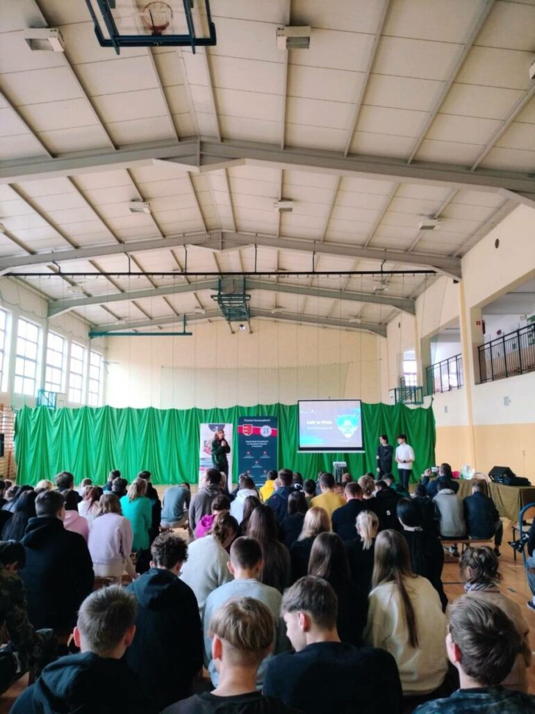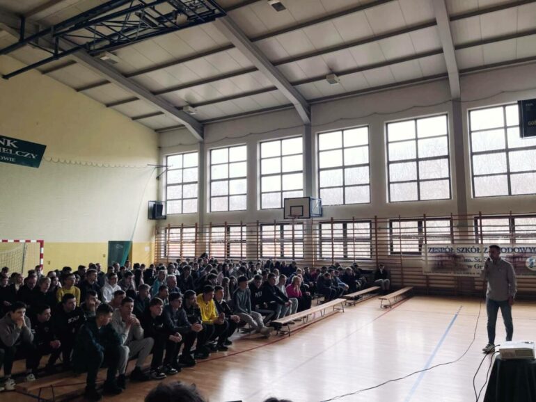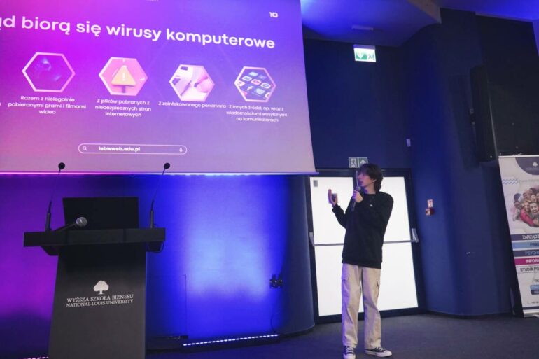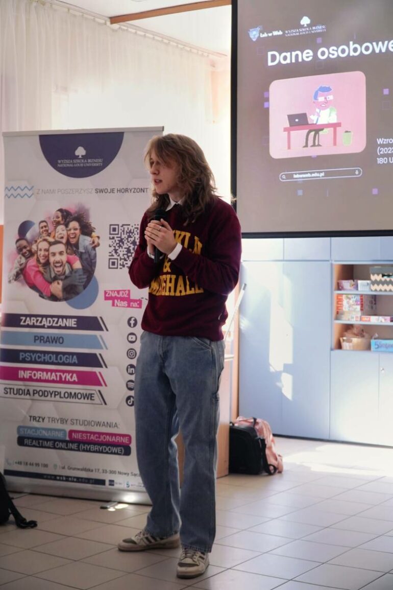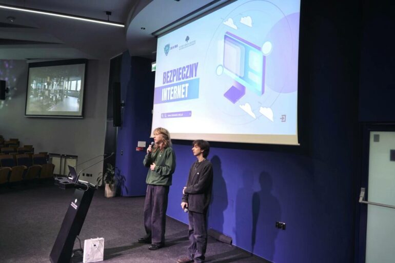 Etap realizacji projektów trwał od 18 grudnia – 2 kwietnia. W tym czasie przeprowadzonych zostało ponad 30 warsztatów i prelekcji w szkołach podstawowych i ponadpodstawowych, a wzięło w nich udział ponad 2200 osób! Młodzi ludzie mieli okazję wystąpić wielokrotnie m.in. na auli WSB-NLU, gdzie ich przekaz trafił do szerszej grupy odbiorców. Podczas spotkań nie tylko omawiali zagrożenia, ale także angażowali uczestników poprzez quizy, interaktywne demonstracje oraz przykłady rzeczywistych cyberzagrożeń – np. „deepfake” lub realistyczne obrazy generowane przez sztuczną inteligencję. Uczniowie „elektryka” wcielili się w rolę wykładowców, dzielili się wiedzą z setkami osób i pokonywali własne bariery. Jak przekonują reakcje uczestników prelekcji przekraczały ich najśmielsze oczekiwania. Usłyszeli m.in, że zajęcia prowadzone przez nich są łatwiejsze do przyswojenia i bardziej angażujące niż klasyczne wykłady. Ludziom szczególnie spodobał się fakt, że wiedza ta przekazywana jest od uczniów dla uczniów, co ułatwia przekaz informacji w taki sposób, by dotarło to do serc słuchaczy.