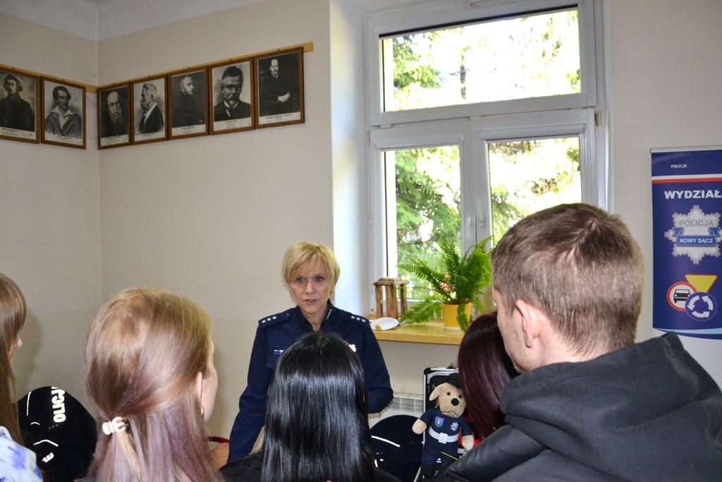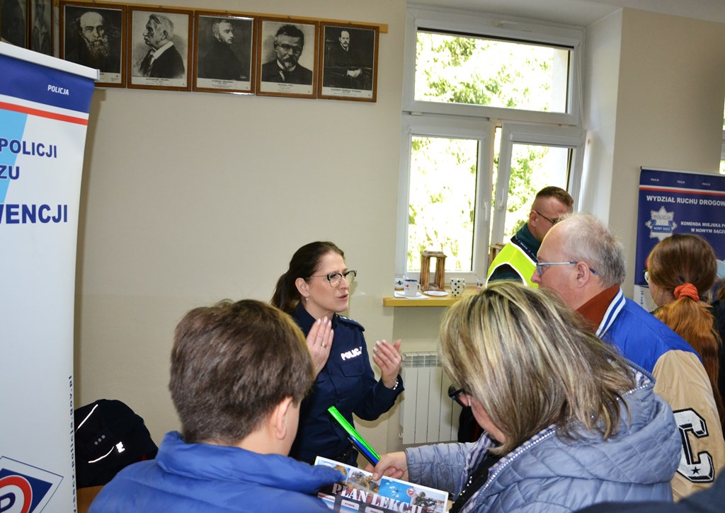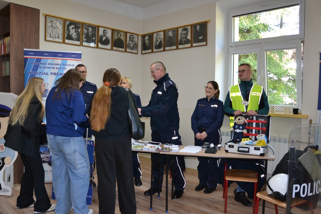 Funkcjonariusze Komendy Miejskiej Policji w Nowym Sączu odwiedzili Zespół Szkół im. Władysława Orkana w Marcinkowicach w ramach zorganizowanego tam dnia otwartego. Podczas wizyty mundurowi przybliżyli specyfikę policyjnej służby uczniom klas ósmych szkół podstawowych, którzy zamierzają podjąć naukę w tej placówce.