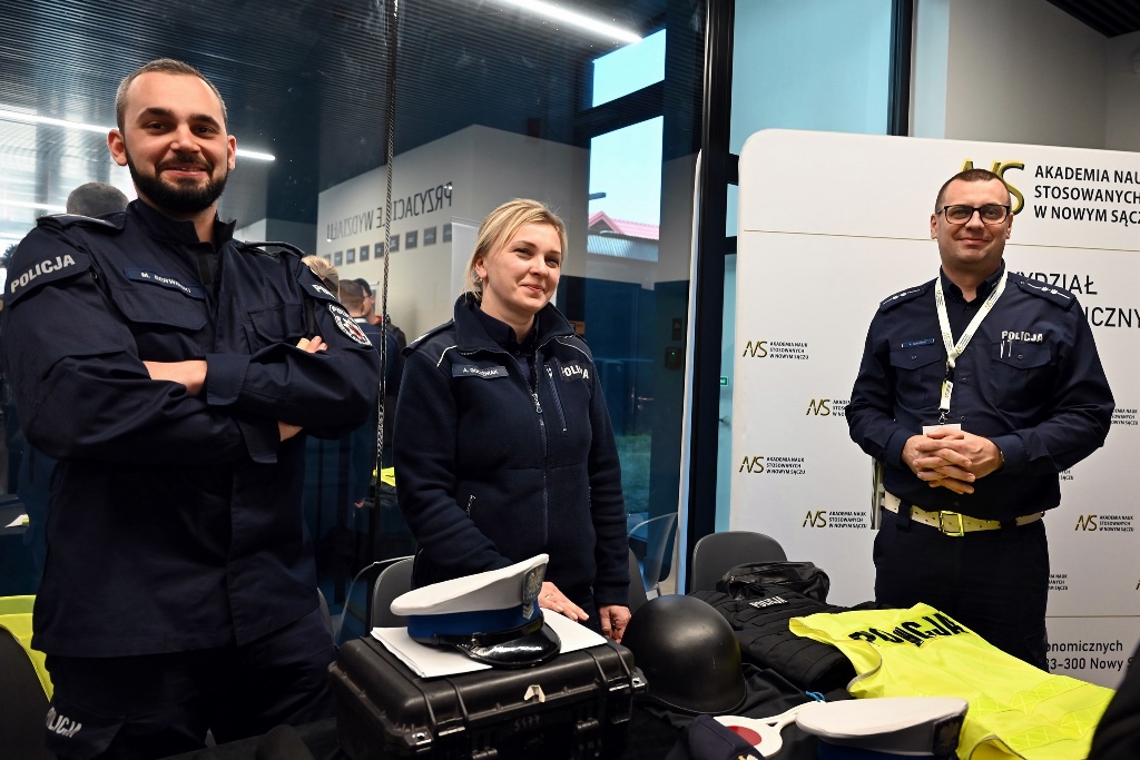 Uczestnicy Dni Kariery spotkali się również z policjantami Wydziału Prewencji, Wydziału Ruchu Drogowego, Wydziału Kryminalnego oraz Wydziału Wspomagającego, którzy przygotowali stoisko promocyjne sądeckiej komendy. Mundurowi przybliżyli studentom funkcjonowanie Policji, a także podzielili się swoimi doświadczeniami zawodowymi, zapoznając młodych ludzi z zadaniami, które realizują na co dzień. Szczegółowo omówili również etapy rekrutacji, wskazując na wymagania stawiane kandydatom, przebieg testów sprawnościowych, egzaminów psychologicznych oraz rozmowy kwalifikacyjnej. Przekazali także informacje na temat szkolenia podstawowego oraz ścieżek rozwoju zawodowego w formacji.