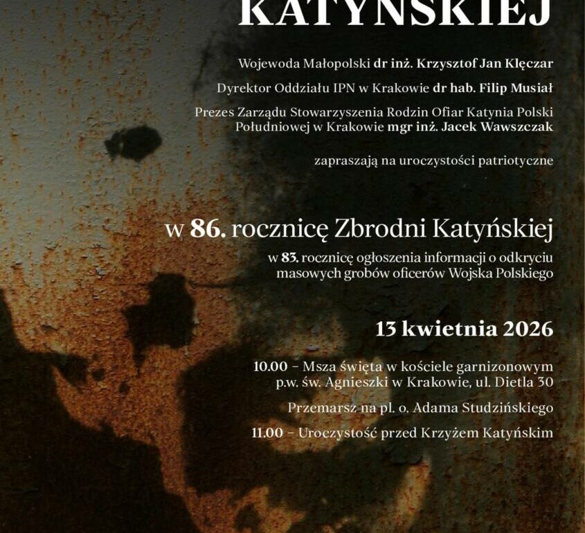 To będzie dzień pełen zadumy, biało-czerwonych flag i przejmującej ciszy. Już 13 kwietnia w całej Małopolsce odbędą się uroczyste obchody Dnia Pamięci Ofiar Zbrodni Katyńskiej. Główne uroczystości w Krakowie zgromadzą setki mieszkańców, polityków i rodzin ofiar pod symbolicznym Krzyżem Katyńskim.