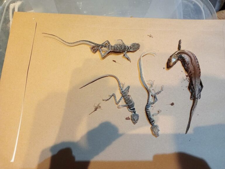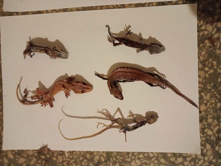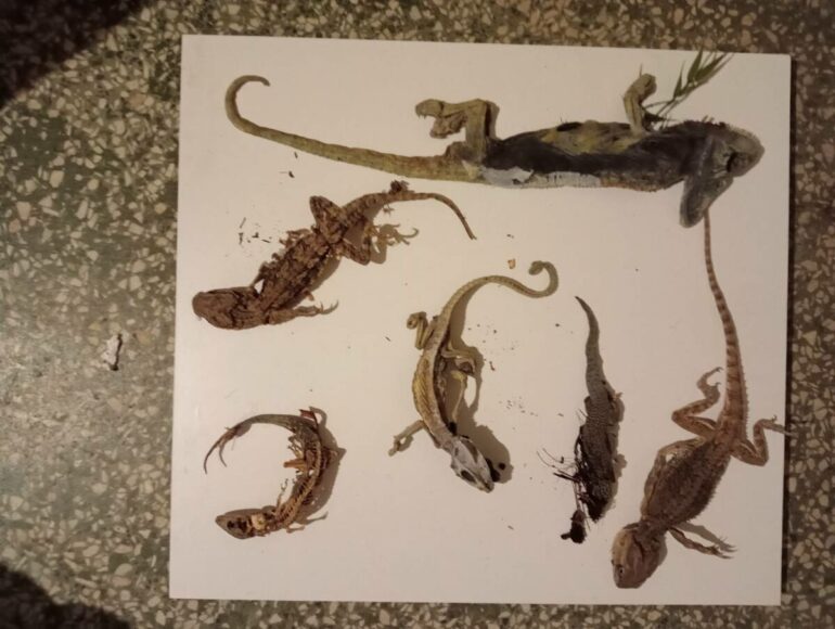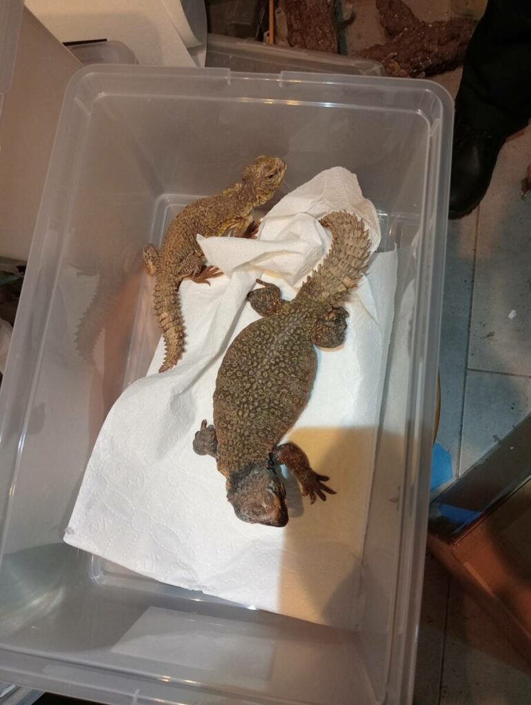 Pozostałe zwierzęta były przetrzymywane w nieodpowiednich warunkach. Niektóre ze zwierząt: nie miały dostępu do wody, były chore, miały rany na ciele. Właściciel zwierząt nie miał dokumentacji leczenia zwierząt. Na miejsce interwencji zostali wezwani technicy kryminalistyki którzy pracowali do późnych godzin nocnych z funkcjonariuszami Policji oraz oboma organizacjami. Nie zostały wydane żadne zalecenia, gdyż właściciel zrzekł się dobrowolnie wszystkich zwierząt miedzy innymi Agam błotnych, Agam brodatych, gekonów, Teju argentyńskiego, kameleonów, felsum madagaskarskich. Interwencja zakończyła się nad ranem.